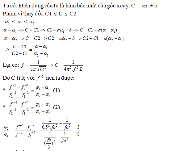 Mạch chọn sóng của máy thu vô tuyến gồm tụ xoay C và cuộn cảm L.Tụ xoay có điện dung C tỉ lệ với hàm bậc nhất với góc xoay α.Ban đầu khi chưa xoay thì mạch thu được sóng có tần số fo.Khi xoay tụ một góc α1 thì mạch thu được sóng có tần số f1=0,5fo.Khi xoay tụ một góc α2 thì mạch thu được sóng có tần số f2=fo/3.tỉ số hai góc xoay α2/α1 là :