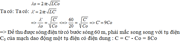 (ĐH-CĐ 2010): Mạch dao động dùng để chọn sóng của một máy thu vô tuyến điện gồm tụ điện có điện dung C0 và cuộn cảm thuần có độ tự cảm L. Máy này thu được sóng điện từ có bước sóng 20 m. Để thu được sóng điện từ có bước sóng 60 m, phải mắc song song với tụ điện C0 của mạch dao động một tụ điện có điện dung