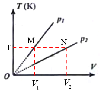 Hình bên biểu diễn hai đường đẳng áp của cùng một khối khí xác định trên hệ trục (T, V).