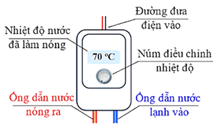 Hình bên là sơ đồ nguyên lí hoạt động của một máy làm nóng nước có dung tích 20 lít và công suất tiêu thụ điện 2500 W. Vào một ngày mùa đông khi bật máy nhiệt độ nguồn nước lạnh đưa vào là $18^{0}C$, khi nước đã được làm nóng đến nhiệt độ tối đa là $70^{0}C$ thì rơ le của máy tự ngắt (trong quá trình này ống dẫn nước nóng ra đang khóa). Nước có khối lượng riêng $\rho = 1000\,\, kg/m^{3}$, nhiệt dung riêng c = 4180 J/kg.K. Hiệu suất làm nóng nước của máy là H = 95%.