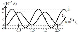 (ĐH2014): Hai mạch dao động điện từ LC lí tưởng đang có dao động điện từ tự do với các cường độ dòng điện tức thời trong hai mạch là i1 và i2 được biểu diễn như hình vẽ.Tổng điện tích của hai tụ điện trong hai mạch ở cùng một thời điểm có giá trị lớn nhất bằng: