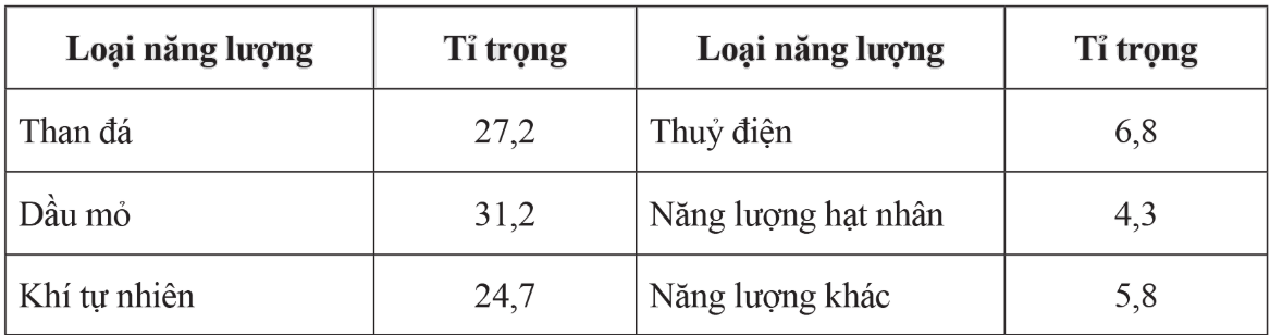 Cho bảng số liệu:Cơ cấu sử dụng năng lượng của thế giới năm 2020(Đơn vị: %)Vẽ biểu