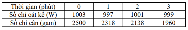 Một nhóm học sinh làm thí nghiệm để xác định nhiệt hóa hơi của nước như sau: nối oát kế với một ấm siêu tốc chứa nước, đặt ấm lên một cân điện tử, cấp điện cho ấm siêu tốc; khi nước đã sôi nhóm học sinh mở nắp ấm để hơi nước thoát ra, và ghi lại số chỉ của oát kế, của cân theo thời gian thì thu được bảng số liệu sau: