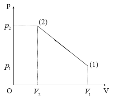 Một lượng khí He chứa trong một xilanh đậy kín bởi một pit-tông biến đổi chậm từ trạng thái (1) đến trạng thái (2) theo đồ thị (hình bên). Biết rằng ở trạng thái (1) khí có thể tích 30 lít và áp suất 5 atm, ở trạng thái (2) khí có thể tích là 10 lít và và áp suất 15 atm. Tỉ số giữa động năng trung bình cực đại và cực tiểu của các phân tử khí trong quá trình trên là bao nhiêu (làm tròn kết quả đến chữ số hàng phần mười)?