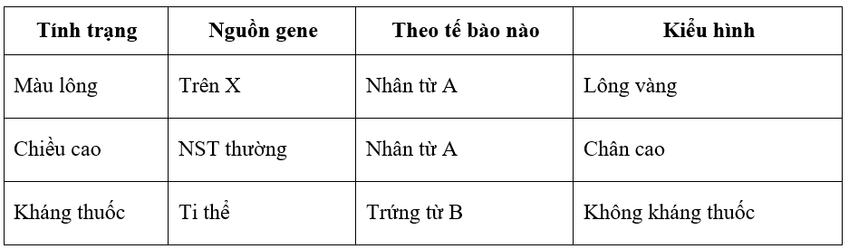 Màu lông: gene trên NST X → theo nhân (từ con cái A – vì chuyển nhân).