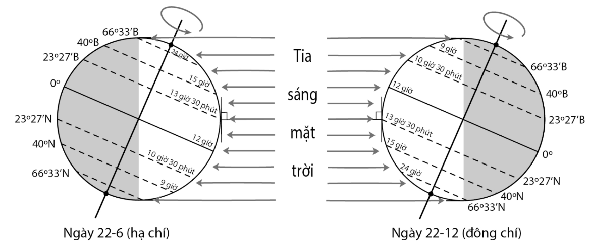 Độ dài ngày đêm ở các vĩ độ vào ngày 22 - 6 và 22 - 12