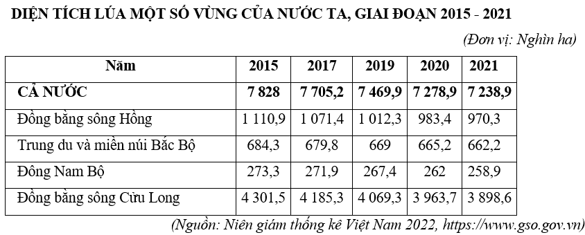 | c) Tỉ trọng diện tích lúa ở Đồng bằng sông Cửu Long năm 2021 giảm 1,3% so với năm 2015. | ||