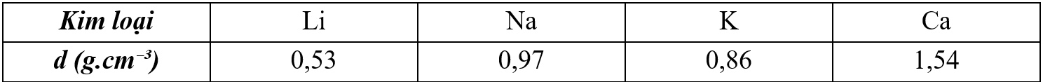 Để bảo quản một số kim loại hoạt động hóa học mạnh, người ta thường ngâm chìm chúng trong dầu hỏa khan (d = 0,80 g.cm⁻³). Khối lượng riêng của một số kim loại nhóm IA, IIA được cho trong bảng bên:
