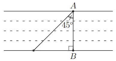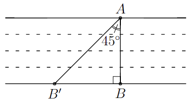 Một người muốn chèo thuyền từ bờ sông bên này (tại điểm A) sang bờ sông bên kia (tại điểm B) theo đường thẳng AB dài 50 m (hình vẽ), nhưng do dòng nước chảy mạnh nên người đó đã bơi lệch $45{^\circ}$ so với phương ban đầu. Hỏi người đó bơi sang bờ chứa điểm B, cách vị trí dự định B bao xa?