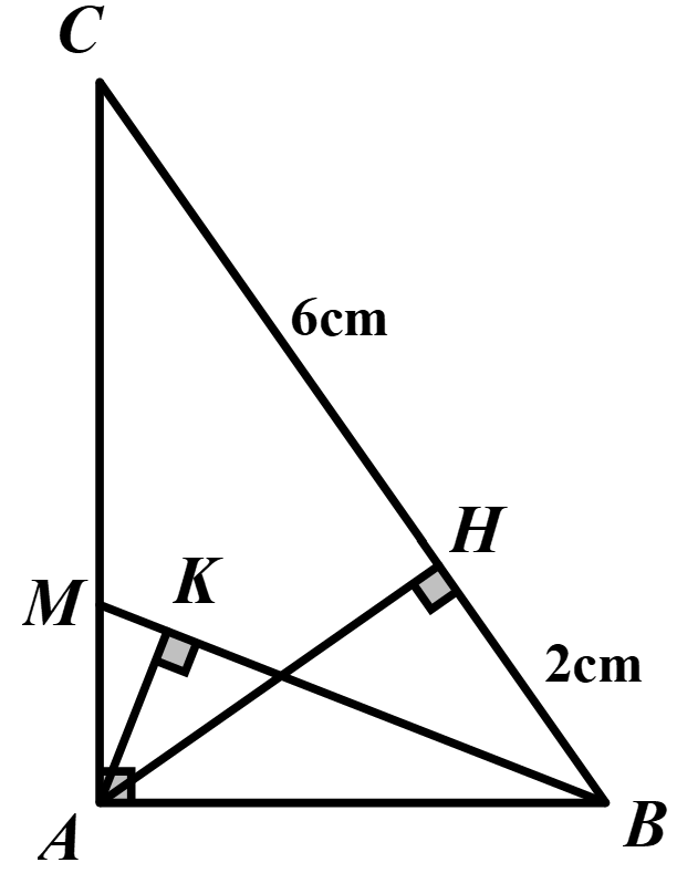 Cho tam giác \(ABC\) vuông tại \(A\,\,(AB < AC)\), có đường cao \(AH\left( {H \in BC} \right)\), \(CH = 6\;cm;BH = 2\;cm\). Lấy điểm \(M\) thuộc cạnh \(AC\), kẻ \(AK\) vuông góc với \(BM\) tại \(K\).