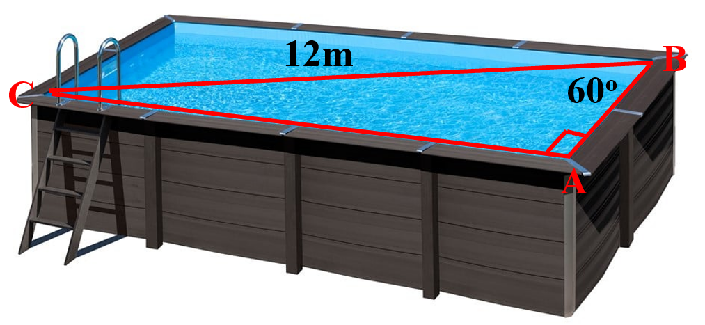 Một bể bơi hình chữ nhật có độ dài đường chéo $BC$ là 12m. Góc tạo bởi đường chéo $BC$ và chiều rộng $AB$ của bể là $60{^\circ}$. Em hãy tính chiều dài $AC$ của bể bơi.