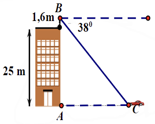 1) Một người có tầm mắt cao 1,6 m đứng trên sân thượng của 1 căn nhà cao 25 m nhìn thấy một chiếc xe đang đứng yên với góc nghiêng xuống $38{^\circ}$. Hỏi chiếc xe cách căn nhà bao nhiêu mét? (làm tròn đến hàng phần trăm).