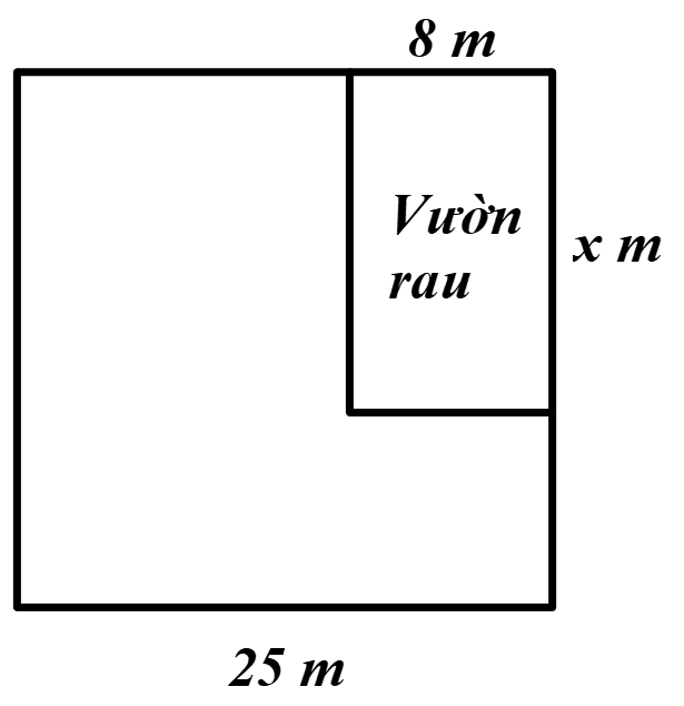 Một khu đất hình vuông với độ dài cạnh là 25m. Cô Hiền muốn dành ra một mảnh vườn có dạng hình chữ nhật với chiều rộng 8m, chiều dài $x\,\,(m)\,\,(8 < x < 25)$. Tìm giá trị lớn nhất của $x$ để diện tích của phần đất còn lại không dưới $473~m^{2}$.