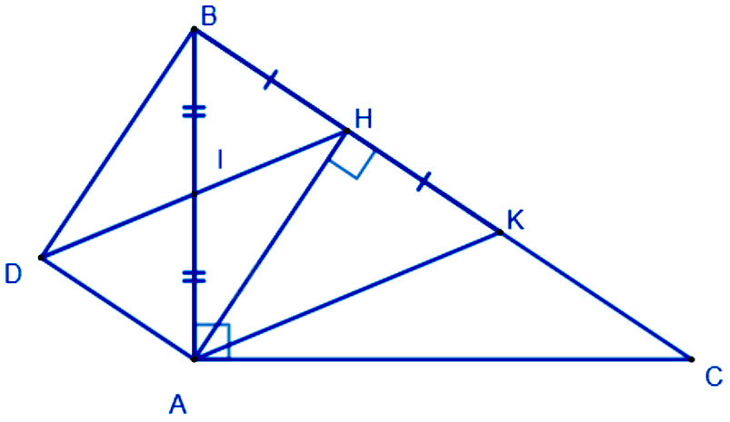 Cho tam giác $ABC$ vuông tại $A$ có $AB < AC$, đường cao $AH$. Gọi I là trung điểm của $AB$. Lấy K đối xứng với B qua H. Qua A kẻ đường thẳng song song với BC, cắt HI tại D.