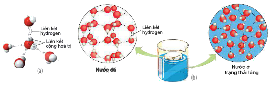 | b) Mỗi phân tử nước có một nguyên tử oxygen liên kết với hai nguyên tử hydrogen bằng hai liên kết cộng hóa trị. | ||