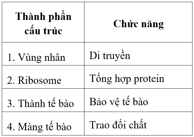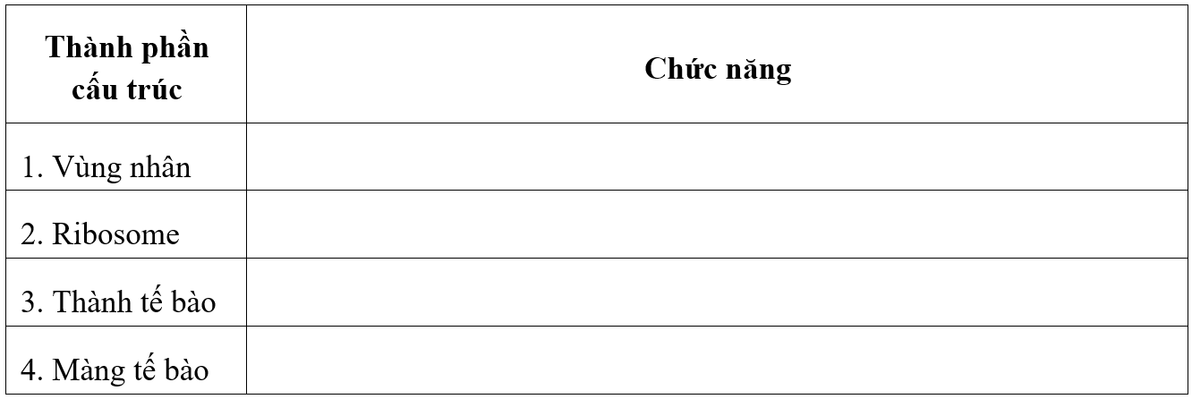 Nêu chức năng của một số thành phần cấu trúc của tế bào nhân sơ theo bảng