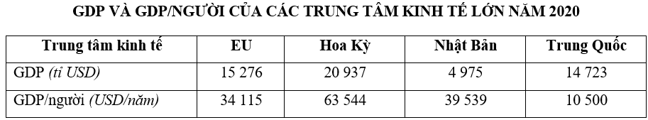Dựa vào bảng số liệu và so sánh các chỉ số GDP và GDP/người giữa các trung tâm kinh tế lớn trên thế giới.
