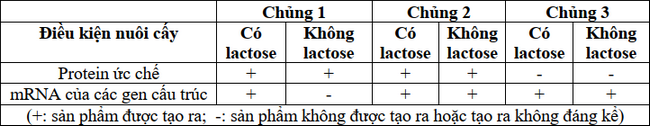 Khi nghiên cứu về hoạt động của operon lac ở ba chủng vi khuẩn E.coli, người ta thu được kết quả sau: