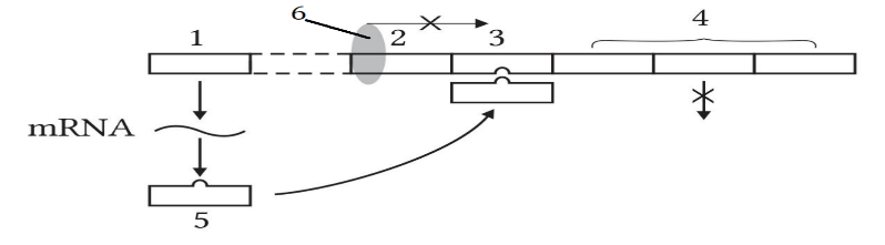 Hình bên mô tả cơ chế điều hòa biểu hiện gene ở vi khuẩn E. coli khi không có đường lactose. Trên hình enzyme RNA polymerase là cấu trúc số mấy?