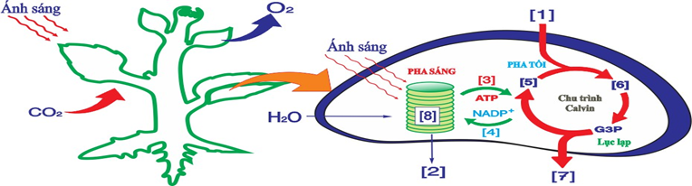 Hình mô tả cấu tạo của lục lạp và sơ đồ quang hợp ở tế bào thực vật sau đây: