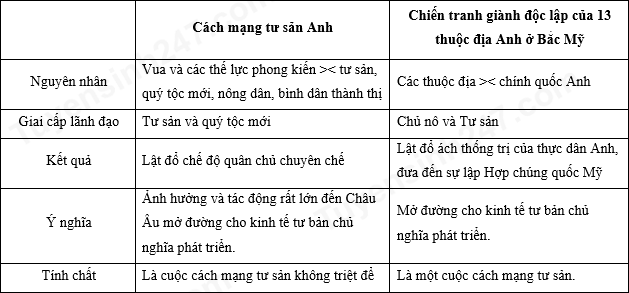 Lập bảng hệ thống về nguyên nhân, giai cấp lãnh đạo, kết quả, ý nghĩa, tính chất của Cách mạng tư sản Anh và Chiến tranh giành độc lập của 13 thuộc địa Anh ở Bắc Mỹ?