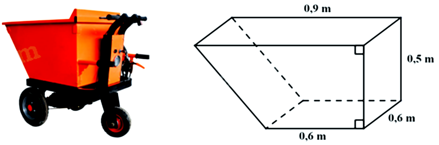 Thùng của một xe rùa điện có dạng hình lăng trụ đứng tứ giác; mặt đáy của hình lăng trụ này là một hình thang vuông có độ dài đáy lớn, đáy nhỏ và chiều cao lần lượt là $0,9m;0,6m$ và $0,5m$, chiều cao của hình lăng trụ là $0,6m$ (xem hình vẽ bên dưới).
