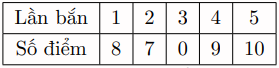 Trong đợt kiểm tra quân sự thường niên tại một đơn vị, ở bộ môn bắn súng AK mỗi người phải bắn 5 phát súng vào bia. Thang điểm bắn là: \(0,4,5,6,7,8,9,10\). Ở 4 lần bắn trước đó, anh A đã đạt được số điểm như sau: