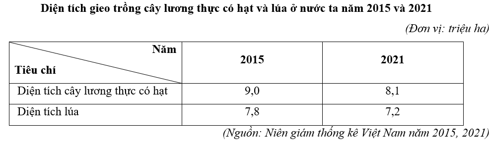 Căn cứ vào bảng số liệu trên, hãy cho biết tỉ lệ diện tích lúa trong tổng diện tích cây lương thực có hạt ở nước ta năm 2021 so với năm 2015 tăng thêm bao nhiêu phần trăm (làm tròn kết quả đến một chữ số thập phân).