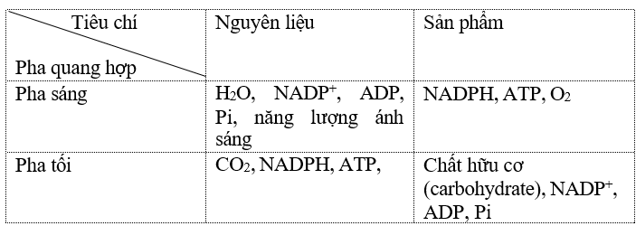 a) Nguyên liệu và sản phẩm của mỗi pha trong quang hợp là gì ?