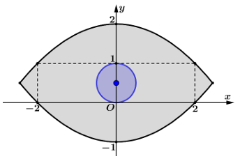 Bạn Bình thực hiện thiết kế một logo hình con mắt cho một phòng khám mắt. Logo là một hình phẳng giới hạn bởi hai parabol $y = f(x)$ và $y = g(x)$ có các kích thước như hình vẽ dưới đây (phần được tô màu đen) và một hình tròn có bán kính bằng $0,5\text{dm}$ở giữa là phần con ngươi (phần được tô màu xanh), đơn vị trên mỗi trục tọa độ là decimet.Biết rằng chi phí để sơn phần con ngươi hình tròn màu xanh là 25000 đồng/$\text{dm}^{2}$ và chi phí để sơn phần còn lại màu đen là 20000 đồng/$\text{dm}^{2}$. Chi phí để sơn logo trên là bao nhiêu nghìn đồng? (Kết quả làm tròn đến hàng đơn vị)