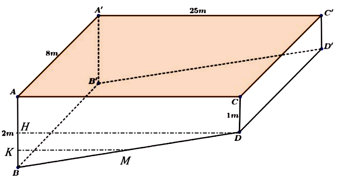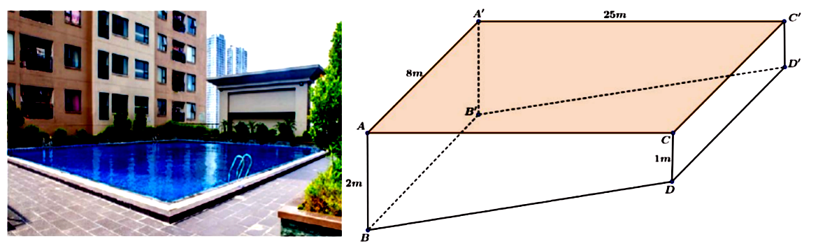 Mặt bể bơi của một dự án chung cư cao cấp có dạng một hình chữ nhật với chiều đài 25m và chiều rộng 8m. Bể bơi sâu 1m ở bên đầu nông và sâu 2 bên đầu sâu. Biết hai đầu nông, sâu thuộc hai bên theo chiều dài của bể bơi (tham khảo hình vẽ minh họa). Ban đầu bể không có nước, nước bắt đầu được bơm vào bể lúc 7 giờ sáng với tốc độ $1m^{3}$ mỗi phút. Vào lúc 7 giờ 36 phút sáng thì mực nước dâng lên với tốc độ $\dfrac{1}{a}$ m/phút. Giá trị của $a$ bằng bao nhiêu?