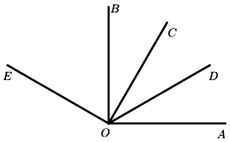 Cho góc vuông $\angle AOB$, hai tia $OC,OD$ ở trong đó sao cho $\angle AOC = \angle BOD = 60{^\circ}$. Trên nửa mặt phẳng bờ $OA$ có chứa tia $OB$ vẽ $OE$ sao cho $OB$ là tia phân giác của $\angle DOE$.