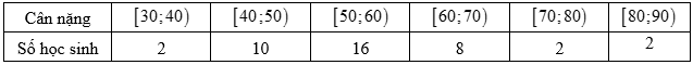 Khảo sát về cân nặng của các học sinh lớp 11D3 người ta được một mẫu dữ liệu ghép nhóm