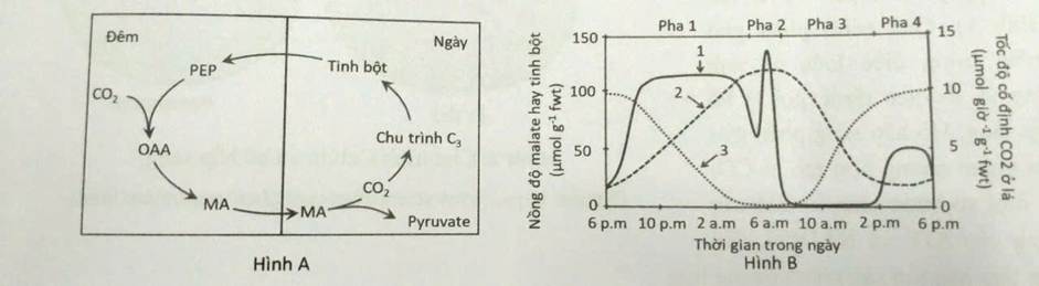 Thực vật CAM có một số đặc điểm thích nghi với điều kiện khô hạn và cố định CO₂ theo các giai đoạn khác nhau trong ngày (Hình A). Nồng độ malic acid (MA) và tinh bột trong lá cũng như tốc độ cố định CO₂ ở lá trong bốn pha khác nhau được biểu diễn theo các đường cong kí hiệu 1, 2 và 3 (Hình B).