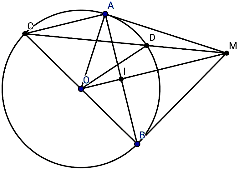 Cho đường tròn $\left( {O;R} \right)$ và điểm $M$ nằm ngoài đường tròn $(O)$. Từ $M$ vẽ hai tiếp tuyến $MA$ và $MB$ của đường tròn $(O)$ ($A,B$ là hai tiếp điểm). Gọi $I$ là giao điểm của $OM$ và $AB$. Từ $B$ vẽ đường kính $BC$ của $(O)$, đường thẳng $MC$ cắt $(O)$ tại $D$ ($D$ khác $C$).
