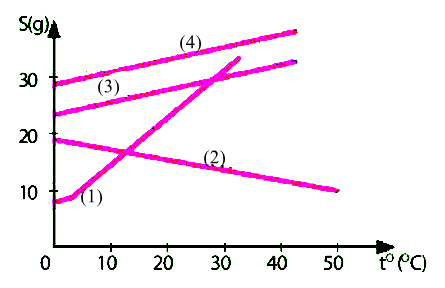 Đồ thị sau biểu diễn sự phụ thuộc độ tan (kí hiệu là S (g)/100 (g) nước) của các chất (1), (2), (3), (4) theo nhiệt độ.