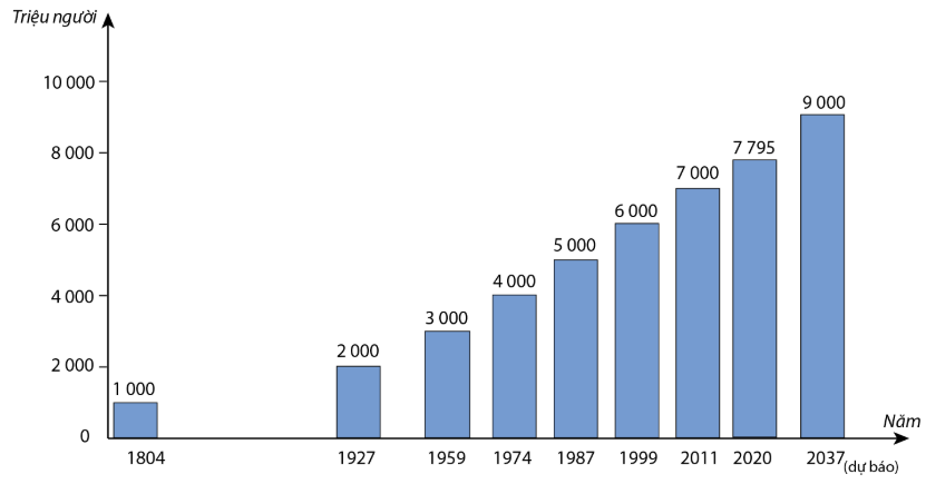 Cho biểu đồ sau:Biểu đồ dân số thế giới giai đoạn 1804 – 2037Theo biểu đồ, cho biết nhận