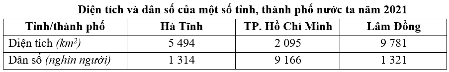 Cho bảng số liệu sau:Căn cứ vào bảng số liệu trên, hãy cho biết tỉnh nào có mật độ dân