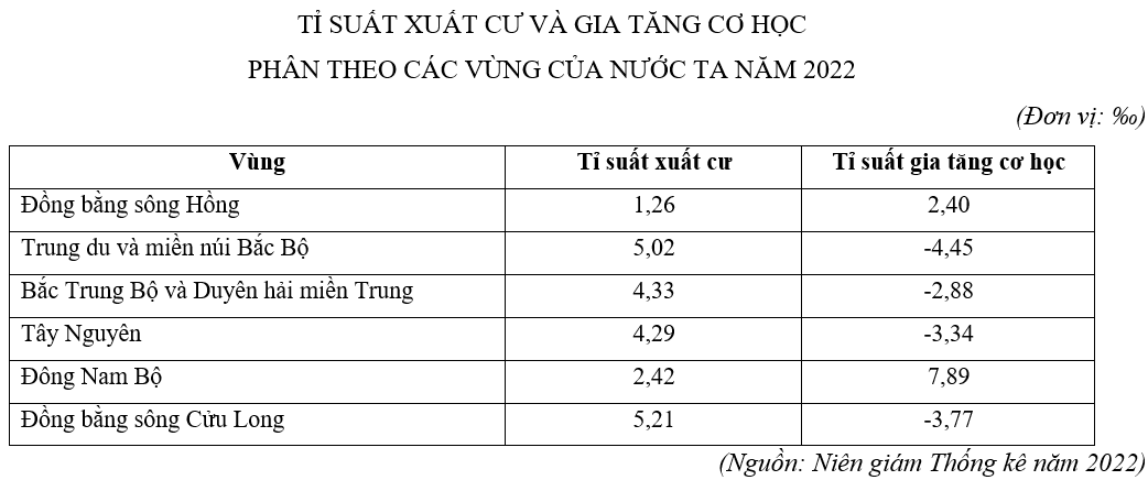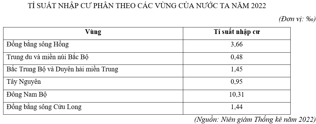 Dựa vào bảng số liệu trên, hãy nhận xét và giải thích sự khác biệt về tỉ suất nhập cư giữa các vùng của nước ta trong năm 2022.