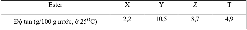4 ester no, đơn chức, mạch hở kí hiệu ngẫu nhiên lần lượt là X, Y, Z, T. Mỗi ester trên đều tạo bởi các carboxylic acid mạch không phân nhánh và ethyl alcohol. Độ tan của 4 ester như sau: