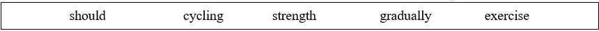 Along with jogging and swimming, cycling is the best all-round forms of (1)_______. It can help to increase your (2) ______and energy, giving you a stronger heart. You don’t carry the weight of your body on your feet when (3)______. It is also a good form for people with a pain in your feet or your back. You should start this hobby (4) ______. Doing too quickly can have bad effects. You should cycle twice or three times a week. If you find you are in pain, you (5)______stop and take a rest.