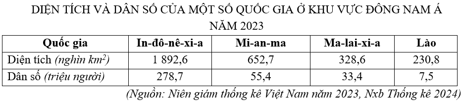 Cho bảng số liệu sau:Theo bảng số liệu, hãy cho biết quốc gia nào có mật độ dân số cao