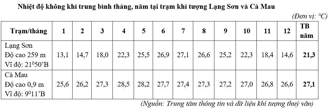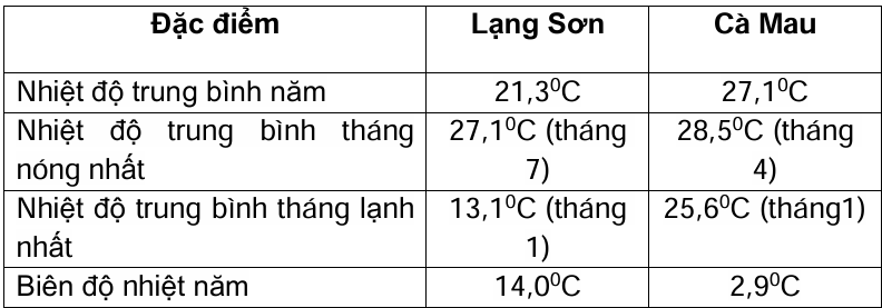 Dựa vào bảng số liệu và kiến thức đã học hãy nhận xét sự khác nhau về chế độ nhiệt (nhiệt độ trung bình năm, nhiệt độ trung bình tháng nóng nhất, lạnh nhất, biên độ nhiệt độ năm) giữa Lạng Sơn và Cà Mau.