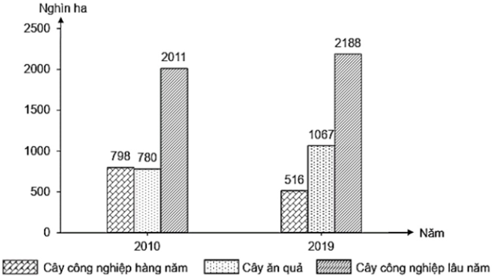 | b) Diện tích cây công nghiệp lâu năm, cây công nghiệp hàng năm và cây ăn quả đều tăng từ năm 2010 đến 2019. | ||