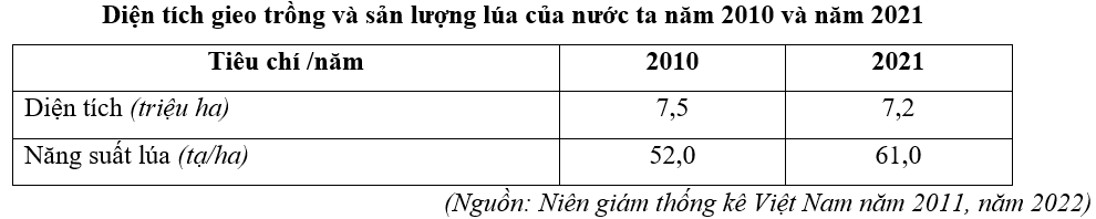 Cho bảng số liệu: Căn cứ vào bảng số liệu, cho biết sản lượng lúa của nước ta năm 2021