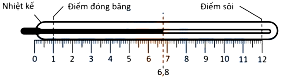 Một thước cm được đặt dọc theo một nhiệt kế thủy ngân chưa được chia vạch như hình dưới đây. Trên nhiệt kế chỉ đánh dấu điểm đóng băng và điểm sôi của nước tinh khiết ở áp suất tiêu chuẩn. Giá trị nhiệt độ đang hiển thị trên nhiệt kế gần nhất với giá trị nào?