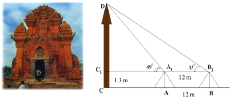 Muốn đo chiều cao của tháp chàm Por Klong Garai ở Ninh Thuận người ta lấy 2 điểm A và B trên mặt đất có khoảng cách $AB = 12~\text{m}$ cùng thẳng hàng với chân C của tháp để đặt hai giác kế. Chân của giác kế có chiều cao $h = 1,3m$. Gọi D là đỉnh tháp và hai điểm $A_{1},B_{1}$ cùng thẳng hàng với $C_{1}$ thuộc chiều cao CD của tháp. Người ta đo được $\widehat{DA_{1}C_{1}} = 49^{{^\circ}}$ và $\widehat{DB_{1}C_{1}} = 35^{{^\circ}}$ ( hình vẽ ). Tính chiều cao CD của tháp ( làm tròn đến hàng đơn vị).