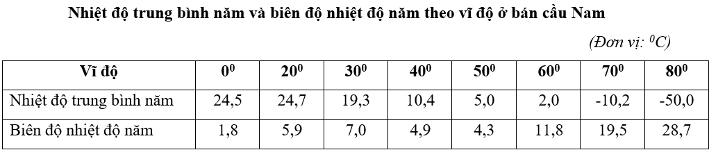 | c) Biên độ nhiệt độ năm tăng từ xích đạo về cực, tăng 200C từ xích đạo lên vĩ tuyến 800. | ||