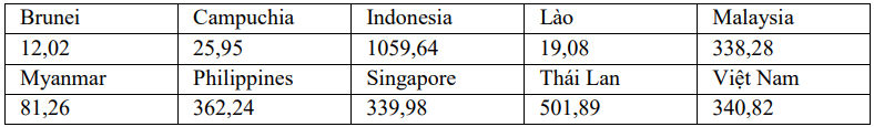 Thống kê GDP năm 2020 (đơn vị: tỉ đô la Mỹ) của 10 nước tại khu vực Đông Nam Á được kết quả như sau: