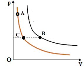 Trên đồ thị đường đẳng nhiệt trong hệ tọa độ pOV, đường nằm trên ứng với nhiệt độ cao hơn.